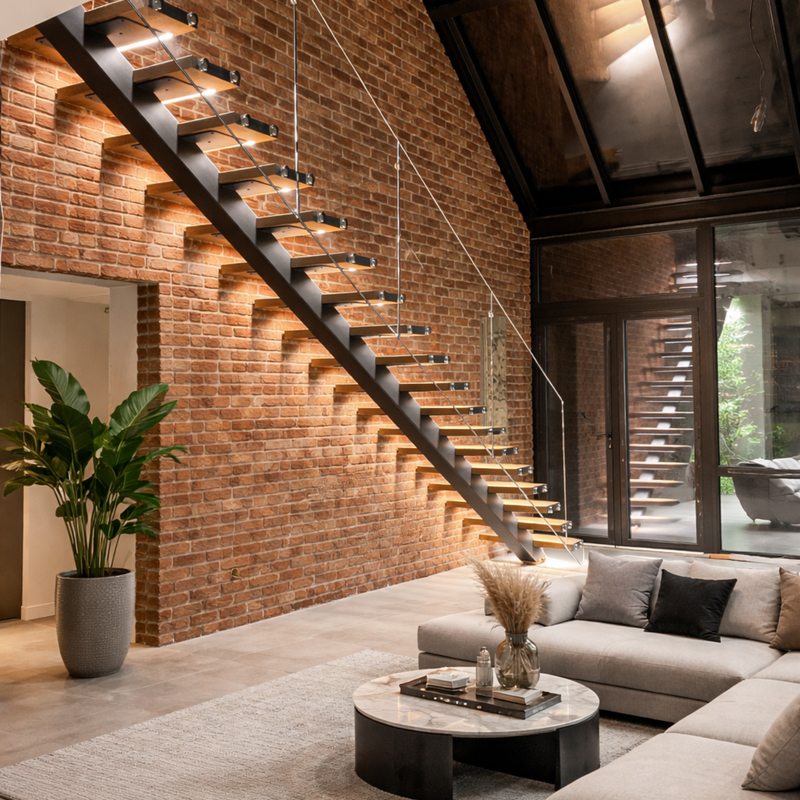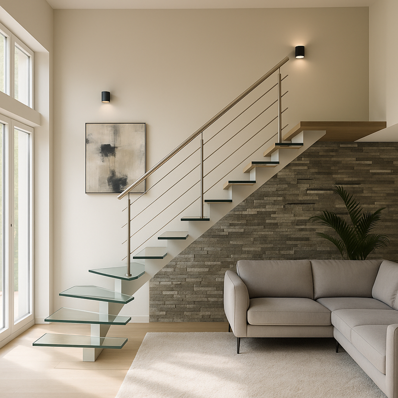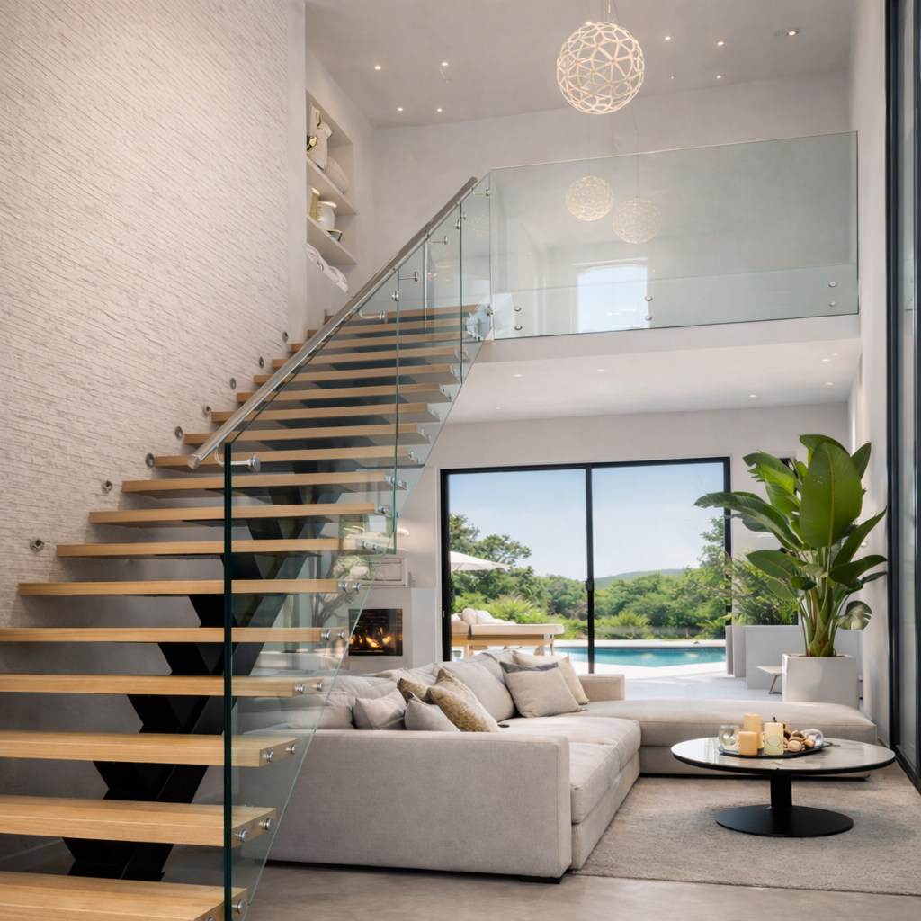 Garde-corps : Verre toute hauteur sur pion avec main courante inox en ecuyer