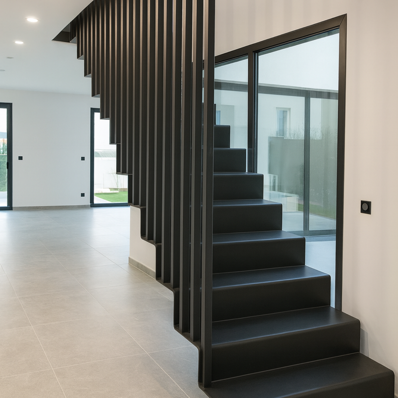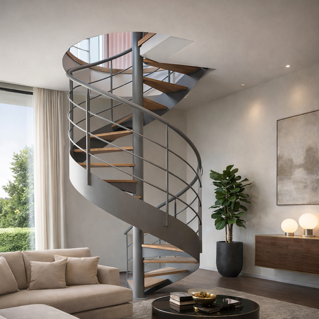 Escalier hélicoïdal à fût central en spirale et limon extérieur débillardé