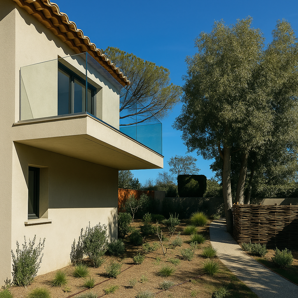 Garde-corps étage : Lisses, poteaux et main courante acier avec soubassement verre