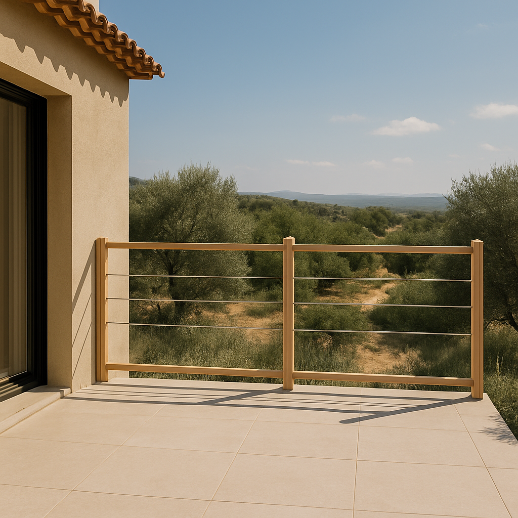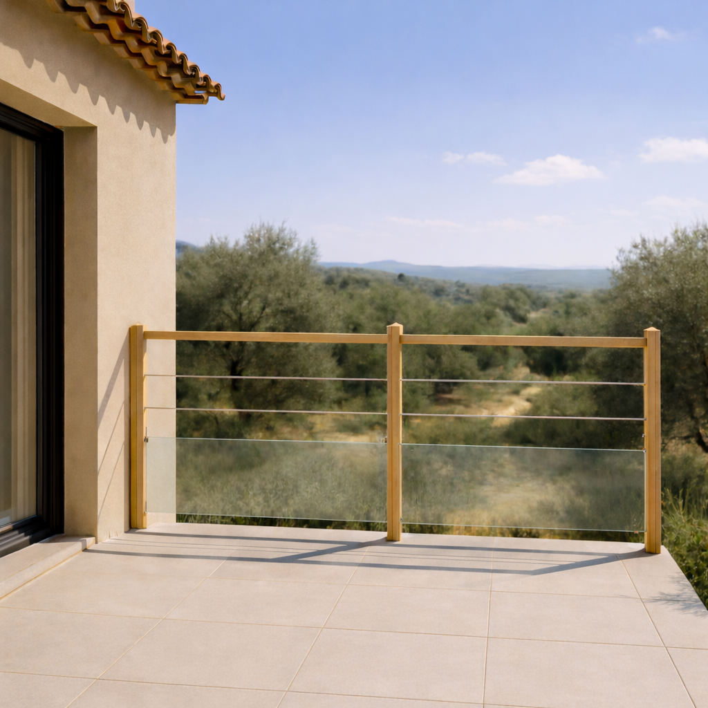 Garde-corps étage : Lisses inox, poteaux et main courante bois