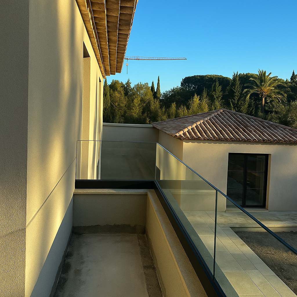 Garde-corps étage : Verre toute hauteur teinté sur rail inox